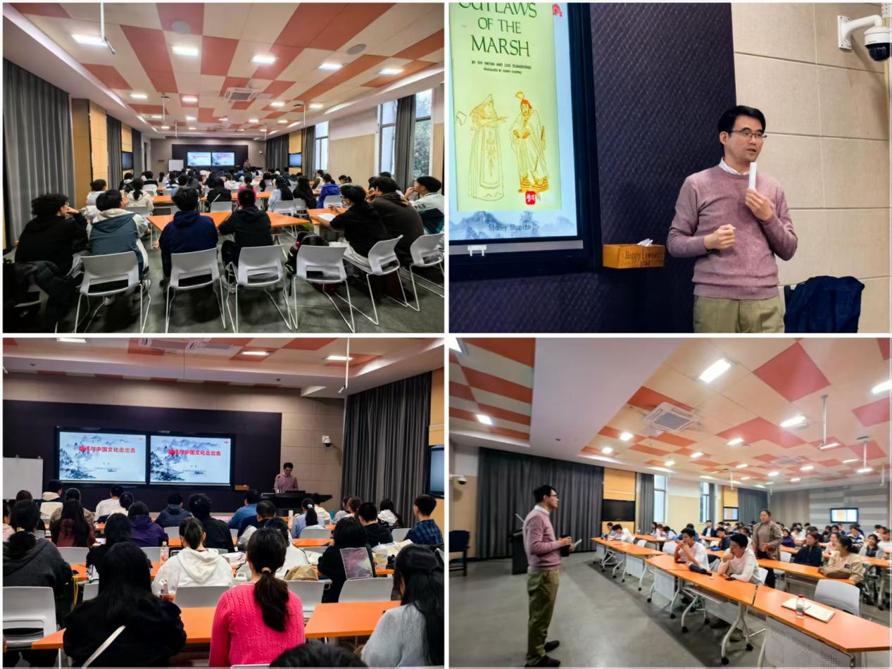 活动邀请我校外国语学院副教授刘毅主讲。他以“翻译与中国文化走出去”为题,从“四大名著”中国经典文学翻译案例切入,阐述了翻译在文明互鉴中的双向桥梁作用。讲座深度剖析了《红楼梦》霍译本、杨译本等经典案例,揭示了翻译如何突破语言表层,传递“弦外之音”的文化密码。此外,他围绕不同翻译家就《水浒传》等经典文学中出现的翻译手段进行对比分析,帮助学生建立“直译与意译”“术语准确性与文化适应性”双重标准的观念。
