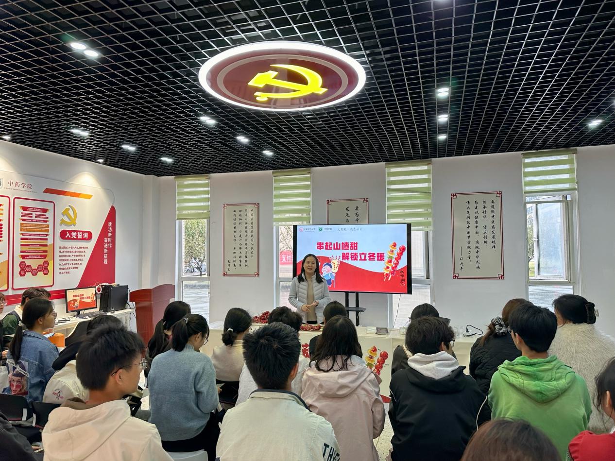 活动中,中药学院中药药理与中医药学系副主任赵志英结合立冬节气的气候特点与人体养生需求,细致讲解了山楂“消食、活血、降脂”的功效,从传统饮食文化角度解读节气养生之道,让大家在轻松氛围中掌握实用的养生知识。