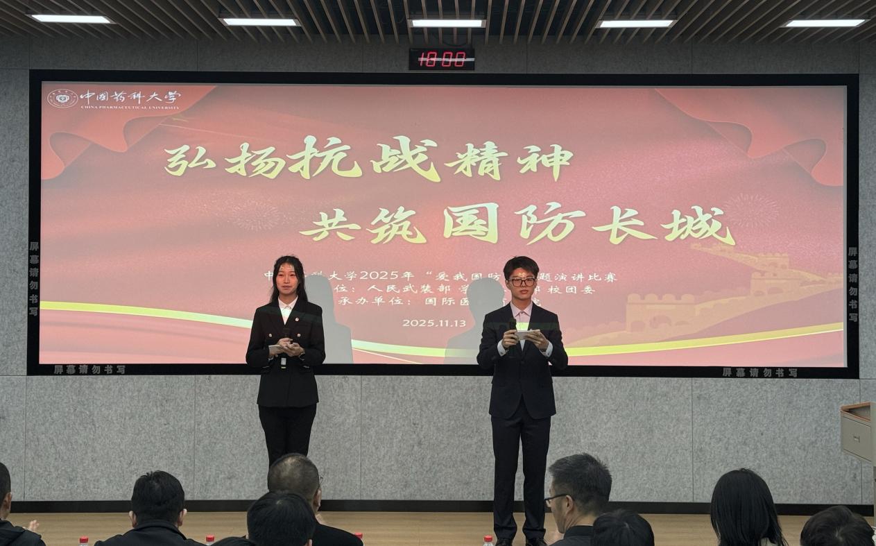 为纪念抗日战争暨世界反法西斯战争胜利80周年,激发在校大学生爱国强军情怀,进一步强化国防观念与国家安全意识,11月13日,我校2025年“爱我国防”大学生主题演讲总决赛在江宁校区教学楼D212教室举行。保卫部(处)部(处)长、人民武装部部长赵雪松,党委宣传部副部长姜晨,学工部、研工部副部长卢献锁,校团委副书记姜玉涛,国际医药商学院党委副书记赵瑾等相关职能部门和院部负责人,以及百余名师生共同参加。