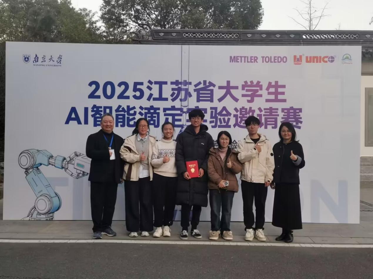 近日,由江苏省化学化工学会主办、南京大学化学化工学院承办的2025年江苏省大学生AI智能滴定实验邀请赛在南京大学仙林校区顺利举办。由我校李嘉宾、李瑞军两位老师指导,曹铭浩、王新阳、宋潇文组成的西皮优统治滴定队获比赛二等奖,陈天悦、张淑琪组成的“数”你最“准”队获比赛三等奖。