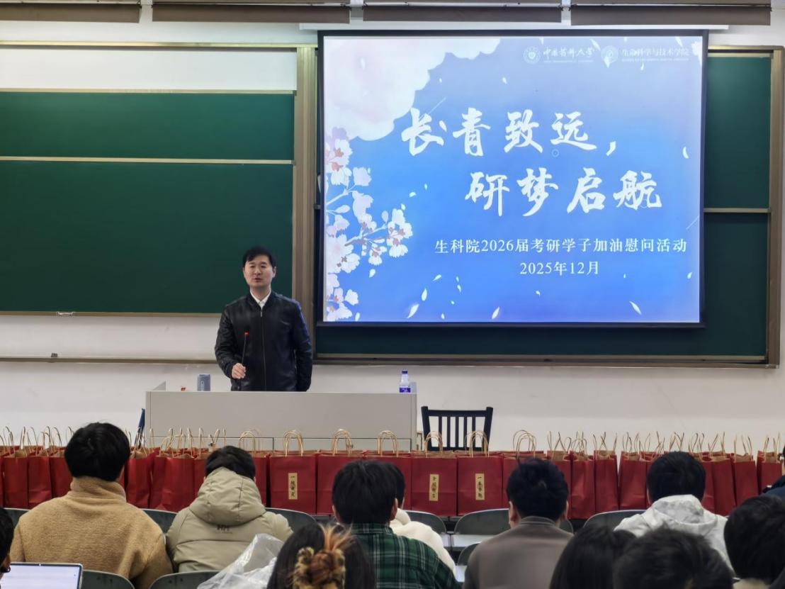 为给考研学子加油鼓劲、舒缓备考压力,12月9日,生命科学与技术学院(以下简称“生科院”)在教学楼B111教室举办“长青致远,研梦启航”考研学子暖心慰问活动。学院党政领导班子与2026届考研学子面对面交流,送上满载关怀的加油礼包与真挚考前祝福。