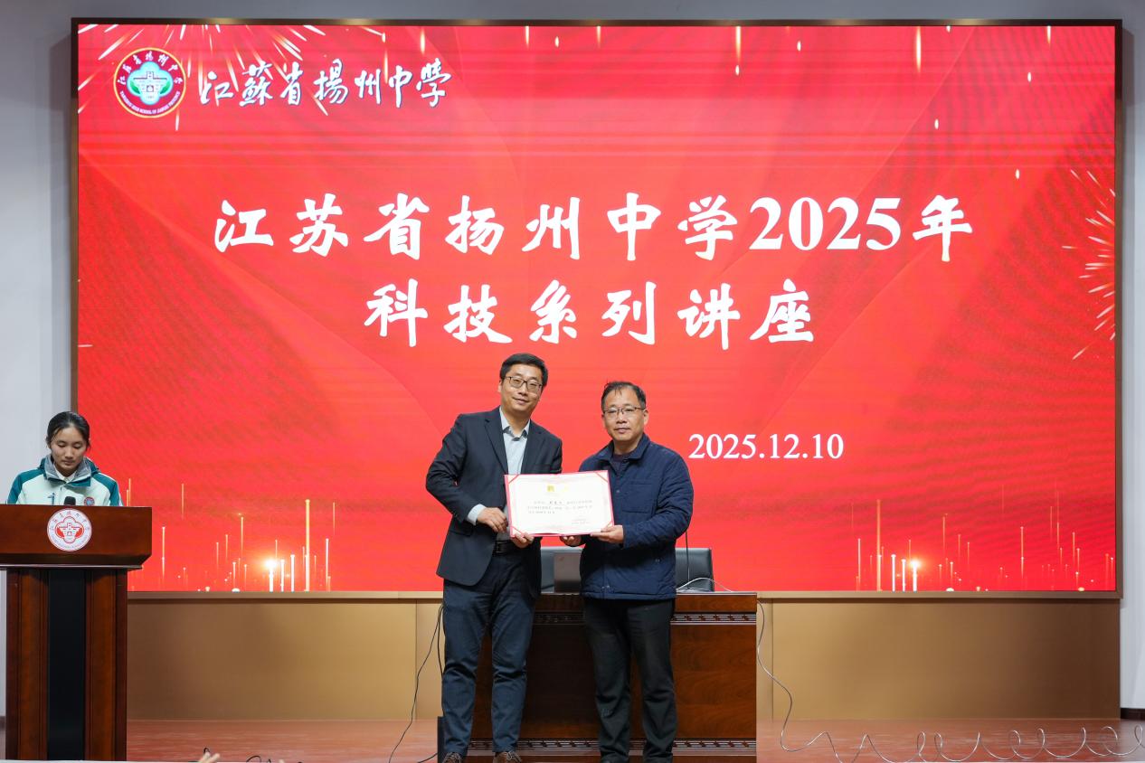 会上,刘东飞受聘为江苏省扬州中学科技副校长。江苏省扬州中学纪委书记王辉林表示,设立“科技副校长”是深化科教融合、提升学生科学素养的重要举措,将为校园带来优质的学术资源和前沿的科学视野。刘东飞表示,助力青少年科学启蒙、引导中学生走近药学、理解药物研发的价值,是高校科研工作者应尽的社会责任。