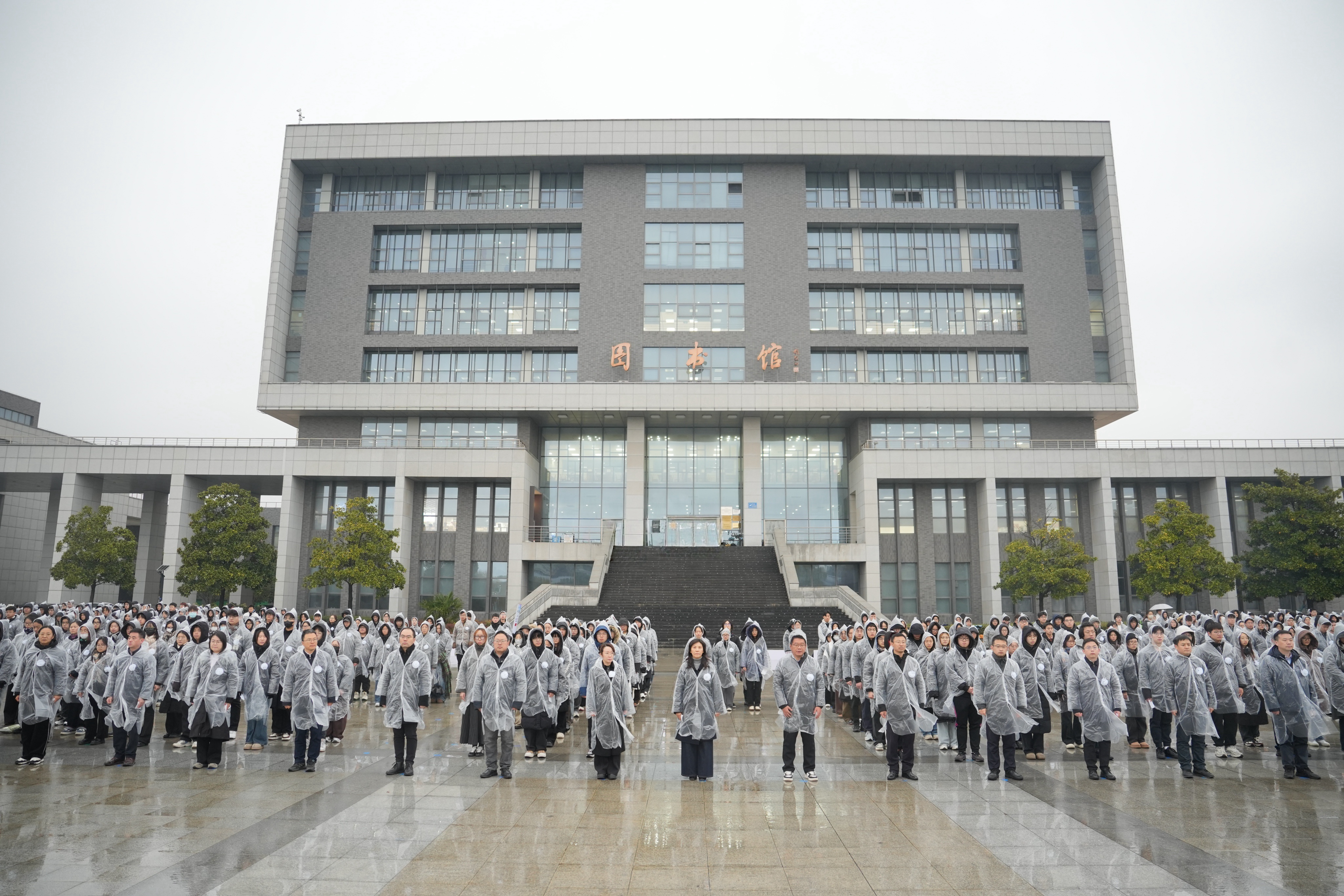 细雨霏霏、寒意肃穆。上午8时,校国旗护卫队迈着整齐的步伐护送国旗入场,全体师生庄严注目。伴随着雄壮的国歌声,五星红旗缓缓升起,至顶端稍作停留后,降半旗致哀。广场上,800余名师生胸前佩戴白花,静静肃立,现场摆出“12·13”字样,以示哀悼。