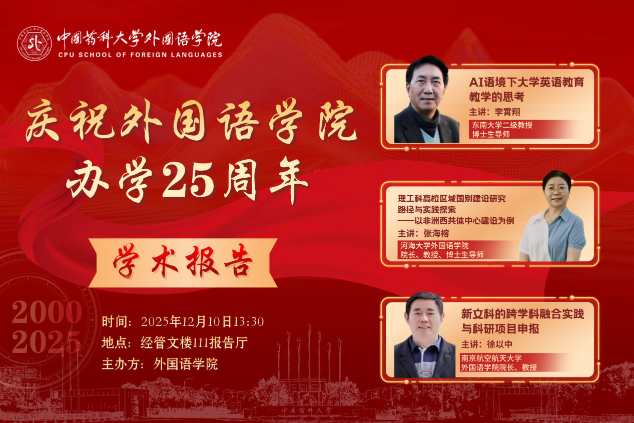 为庆祝办学25周年,汇聚学术智慧,共谋发展新篇,12月10日下午,外国语学院在江宁校区经管文楼举办专题学术报告会。报告会特邀省内三位外语学界知名专家作主旨报告,学院全体教师到场聆听,报告会由外国语学院院长赵光慧教授主持。