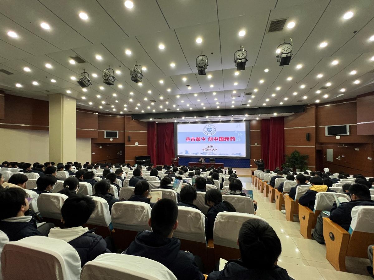活动中举行了我校与江苏省常州高级中学共建百草园的揭牌仪式。仪式结束后,杨华为高二年级学生开展了题为《承古御今 创中国新药》的药学科普讲座。她以“初识、明辨、熟知、勇担”为关键词,围绕药学世界的演进脉络、医药行业的时代变革、学校的发展历程和中国药大人的光荣使命等方面,通过深入浅出的讲解和生动有趣的案例,为学生介绍了药物发展历史、当下面临的挑战、我校发展历程、专业特色、发展前景及中国药大人的使命担当,帮助同学们解码生物医药的奥秘,激发了同学们对中国药科大学的向往和热情。