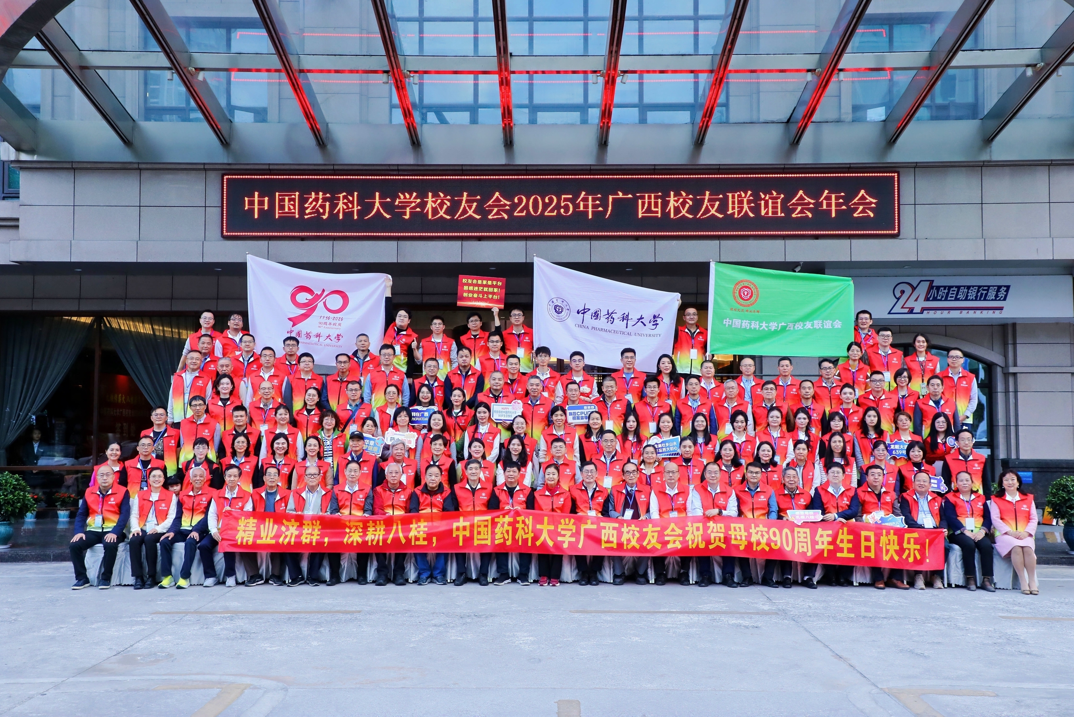 年会期间还举办了校旗全球传递活动广西站校旗交接仪式,1956级校友王如治、1999级校友黄鹏代表广西校友会接过校旗、校庆旗,共同开启广西站传递活动。