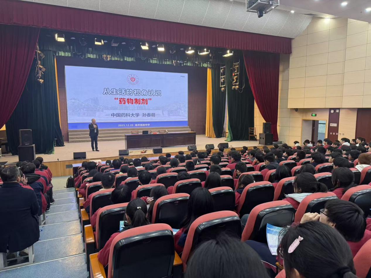 讲座邀请发展规划与学科建设处副处长、博士生导师孙春萌教授为全体高三学生带来了一场题为《从生活的视角认识“药物制剂”》的精彩讲座。孙春萌从药学的历史渊源讲起,深入浅出地阐述了药物制剂的发展历程及其在人类健康中的核心作用。他巧妙地运用烹饪佐料类比药用辅料的功能,并引用影视作品等生动案例,将复杂的药物在体内的吸收、分布过程讲解得通俗易懂。他指出,药物制剂不仅是科学,更是关乎国家安全和人民健康的重要产业,鼓励同学们关注国家在医药领域的“卡脖子”问题,树立远大的科学报国志向。