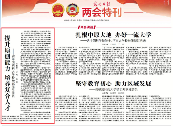 3月11日,《光明日报》两会特刊以《提升原创能力培养复合人才》为题专访全国政协委员、我校校长郝海平。今年《政府工作报告》提出,打造集成电路、航空航天、生物医药、低空经济等新兴支柱产业。本次专访围绕2026全国两会期间郝海平委员关于“建设国家原创药物研发生态区”“建设人工智能药学国家实验室”“完善我国药品多元支付体系”等三个提案展开,深度聚焦生物医药产业发展、未来产业布局及人才培养。