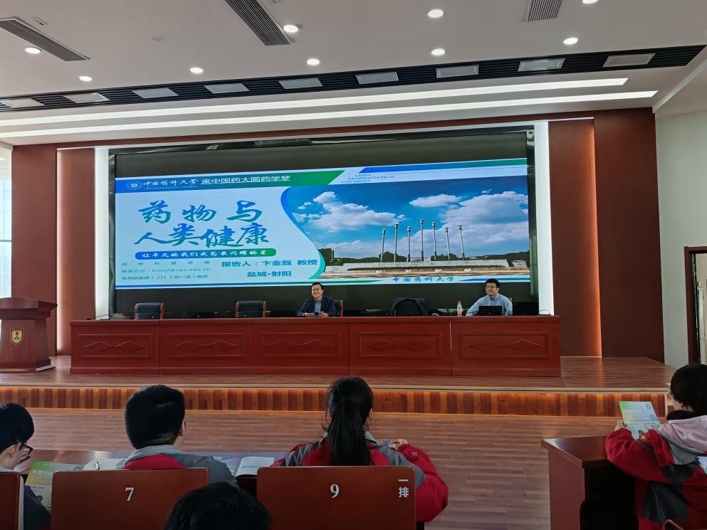 活动期间,药学院教授卞金磊以《药物与人类健康》为题为中学师生作科普讲座,系统介绍了药物的基本内涵及其与人生健康的密切关系,解析药物发展历程与新药研发的基本过程,并结合经典案例展示药物创新之路,鼓励优秀学子投身药学事业,勇担“健康中国”时代重任。