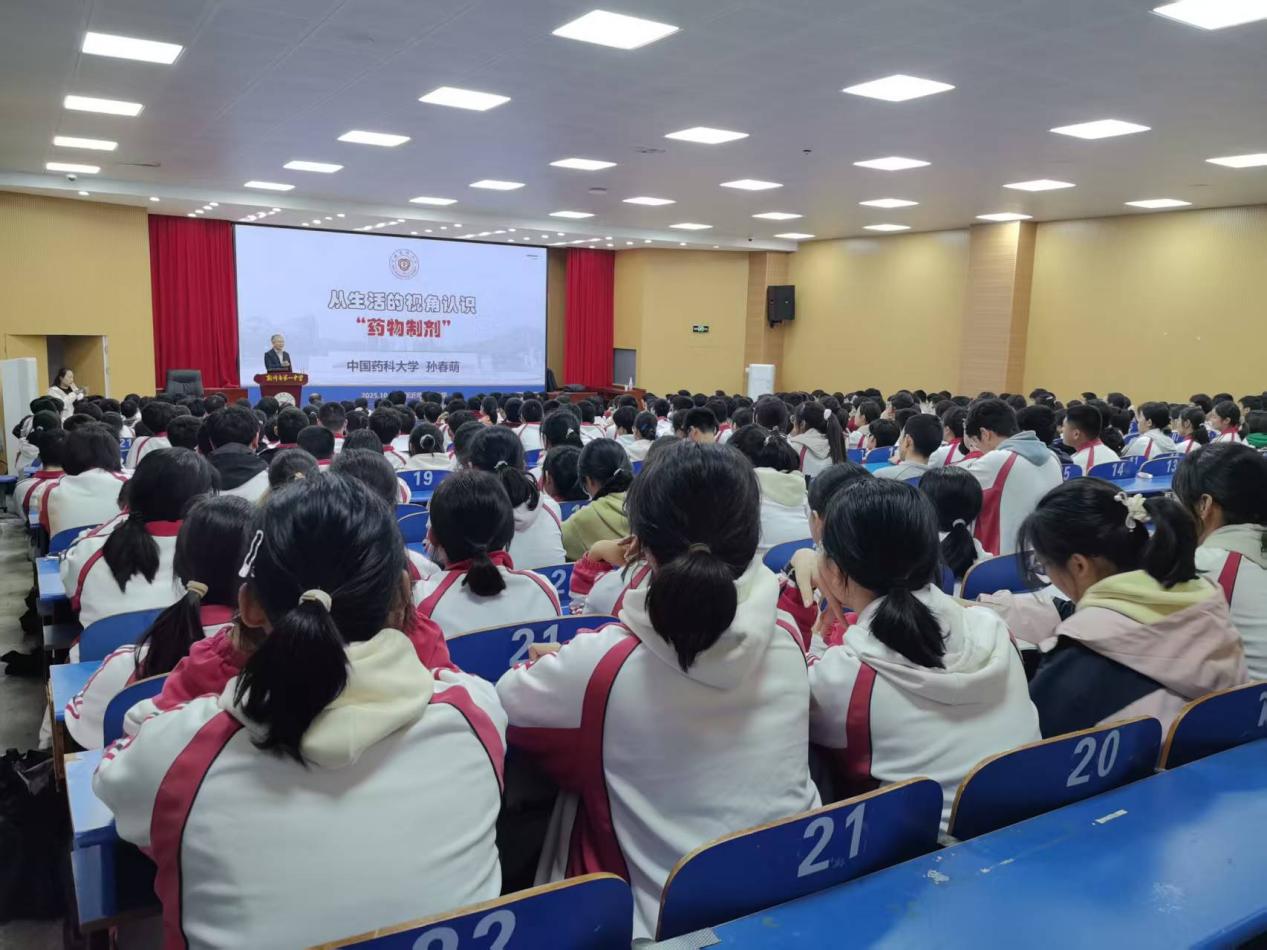 其间,孙春萌分别为丰县中学、新沂一中的1100多名学生开展科普讲座。他以《从生活的视角认识“药物制剂”》为题,用通俗语言解读了药物制剂的原理、应用及前沿发展,让抽象的药学知识变得鲜活易懂,现场反响热烈,学生掌声不断。