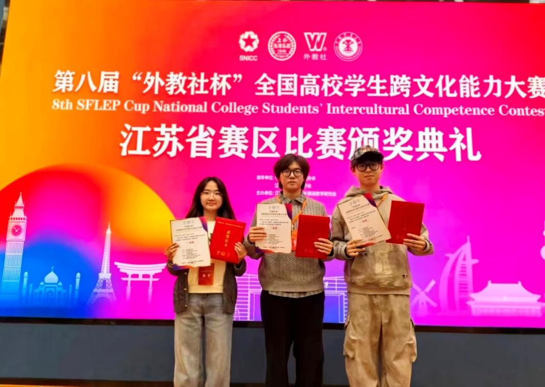 10月24日至26日,第八届“外教社杯”全国高校学生跨文化能力大赛江苏省赛在中国矿业大学举行。我校王腾博、王庞歆然、蒋雨坤三位同学组成的代表队,凭借扎实的英语功底、敏锐的跨文化洞察力和出色的团队协作精神,在比赛中沉着应对、表现出色,最终荣获本科中国学生组一等奖。