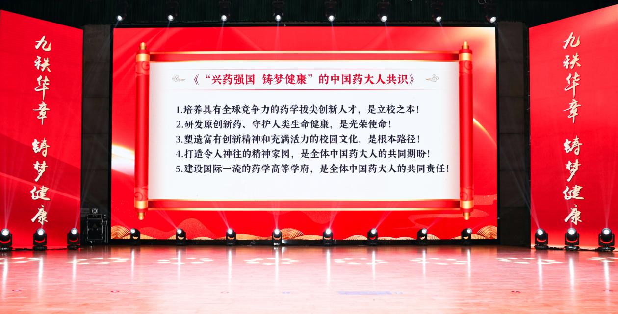 戴建君在讲话中表示,走过的89年峥嵘岁月,学校始终与中华民族命运休戚与共,与国家医药卫生事业发展心手相牵,一直引领药学高等教育高质量发展。今日之中国药大,党的全面领导扎实有力,教育科技人才一体发展取得新成就,高质量发展迈上新台阶。他在讲话中感恩了每一位在学校办学历程中栉风沐雨、奠基立业的先贤和前辈,由衷致敬了每一位心系母校的校友,真诚礼赞了每一位勤勉敬业、开拓进取的师生员工,诚挚感谢了89年来对学校事业发展给予关心帮助的各级领导、广大校友和各界朋友。他强调,90周年校庆既是学校发展史上承前启后、继往开来的里程碑,更是学校向着“药学特色、世界一流”百年建设目标砥砺前进的崭新起点。希望大家更加紧密地团结起来,坚守为党育人、为国育才初心使命,落实立德树人根本任务,在教育强国建设和服务经济社会发展中打头阵、勇争先、走在前、作示范,以团结奋进、锐意进取的昂扬风貌,以高质量发展的卓越成就为明年建校90周年校庆献礼!