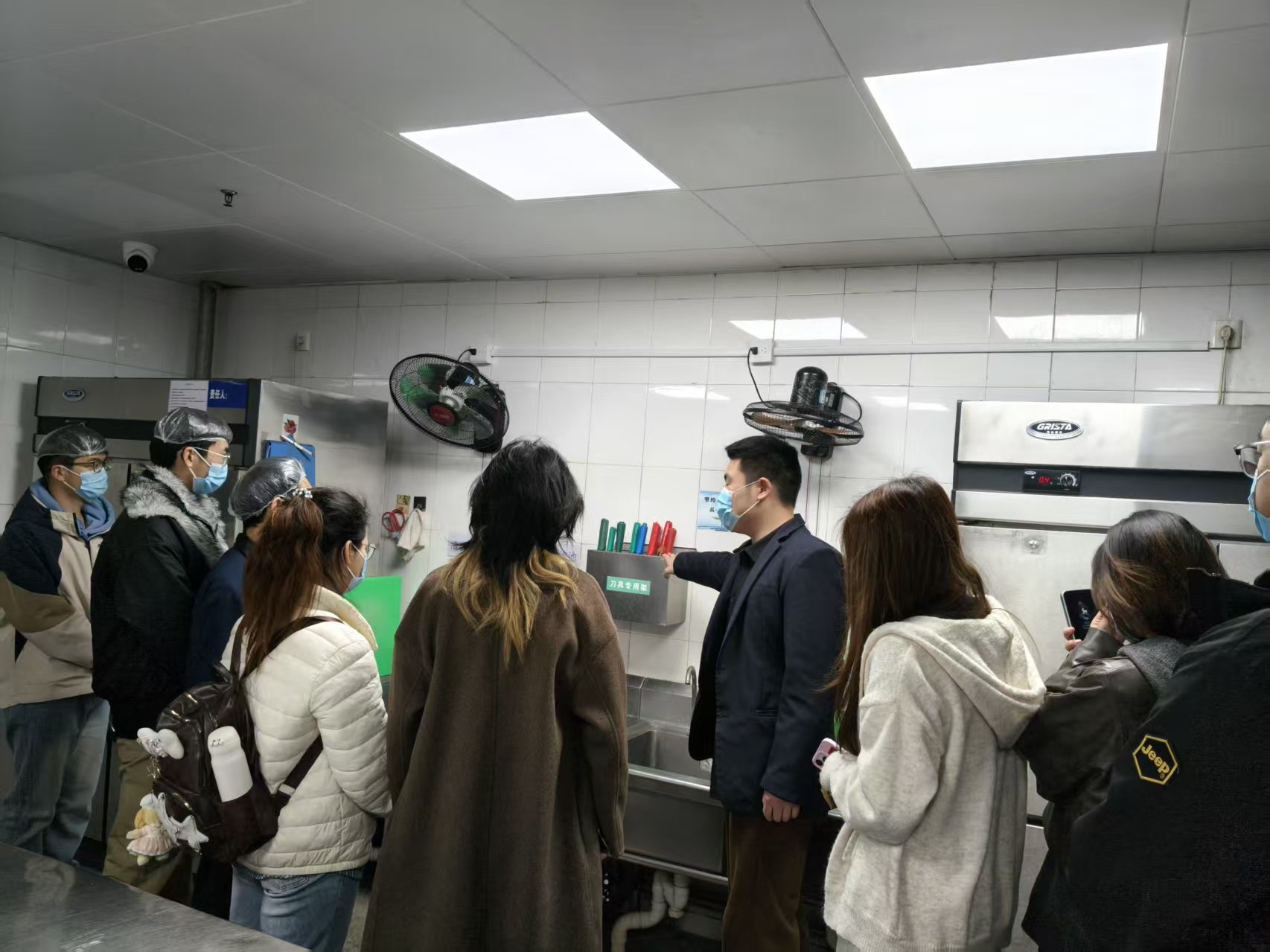 活动伊始,食堂工作人员全程引导,带领学生零距离参观食堂后厨。同学们依次走进食品快检室、操作加工间、原料验收处及食品留样等关键区域,深入了解各环节的操作流程,对食堂严格的准入机制和日常管控有了直观认识。